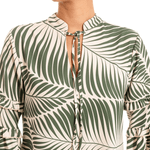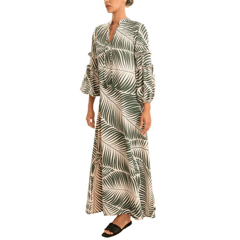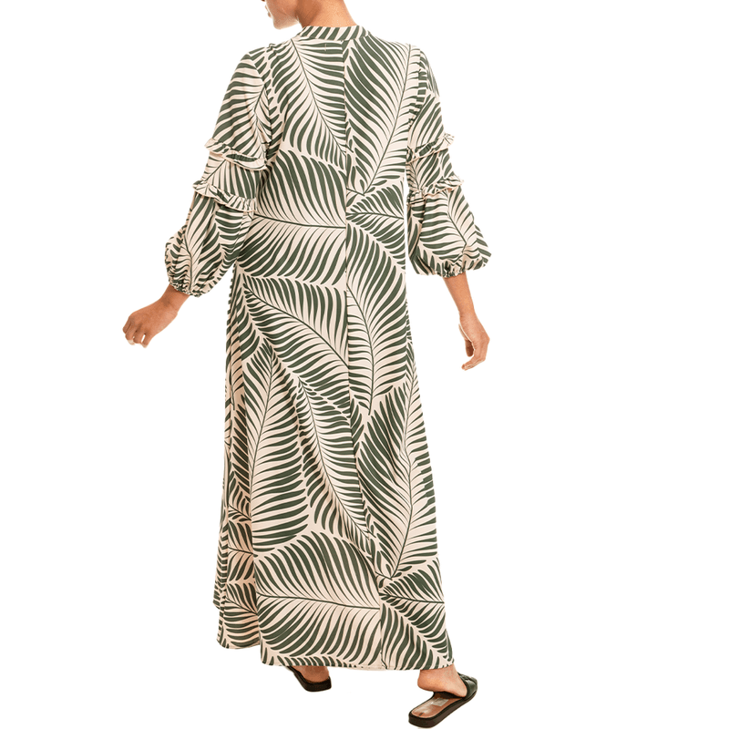 Vestido elaborado en crepè, con estampado de palmeras detalle de cuello nerú y mangas volumètricas con detalles de ruches