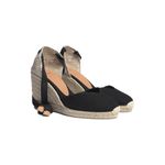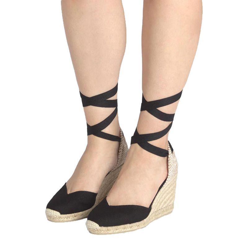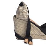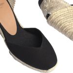 Alpargatas cuña de color negro, lienzo de agoldón en forma de V, corbata con cordones, suela de punto de yute y caucho. Altura de 9cm, cuña de 8cm y plataforma de 1cm, composición: Tejido 100%, Yute 100% / Suela: Caucho 100%.