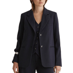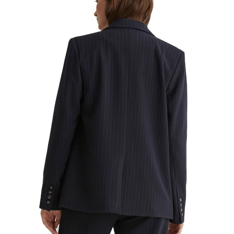 Americana de tejido jacquard con rayas navy, de corte elegante y estilo contemporáneo. Una prenda clave para looks formales o conjuntos coordinados con carácter.