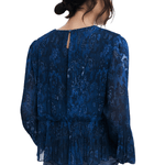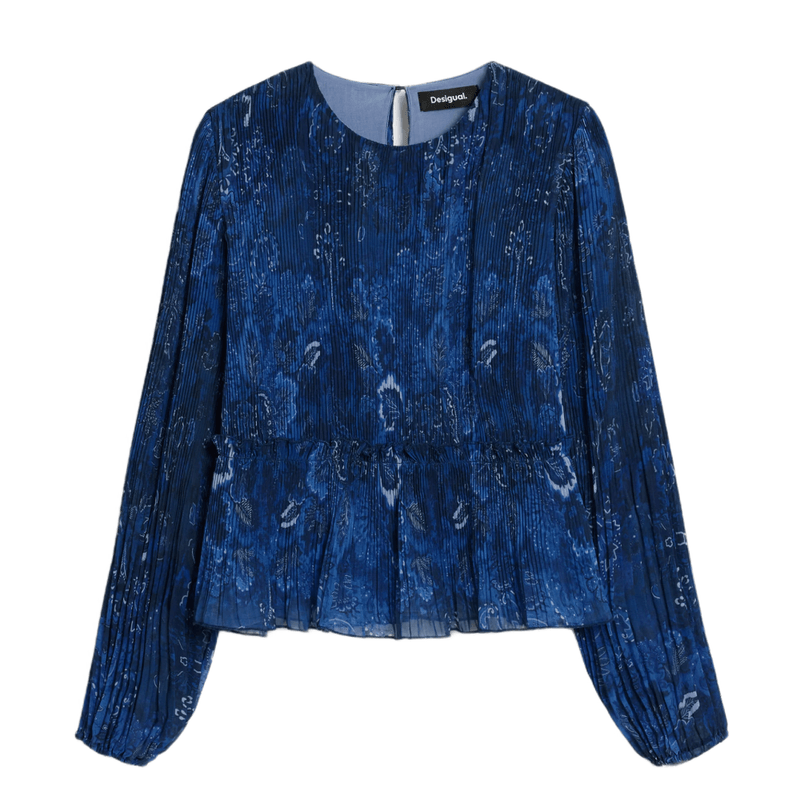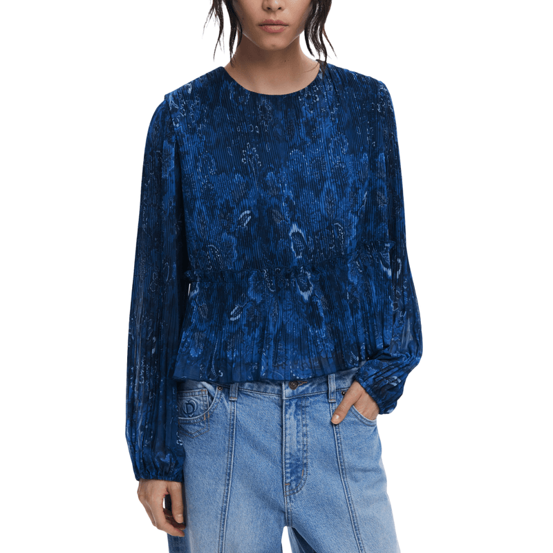 Blusa confeccionada en tejido plisado, con manga larga abullonada, cuello redondo y volante elástico en cintura con estampado ornamental.