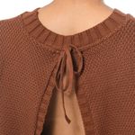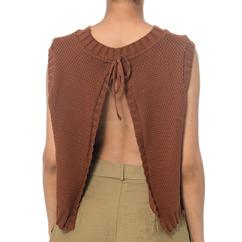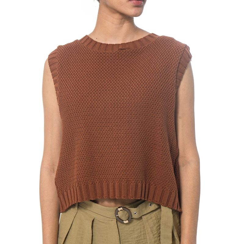 Chaleco tejido sin mangas en color terracota, con un diseño de punto grueso que aporta textura y calidez. Cuenta con cuello redondo y un corte recto y amplio, ideal para un look casual y cómodo. Perfecto para combinar con camisas o usarlo solo con pantalones de tiro alto.