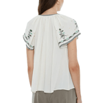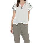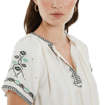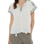 Blusa de mujer, manga corta y escote pico. Detalle de bordados florales en manga y bordado tipo étnico en escote. Contorno escote fruncido y cinta terminada con borlas. Regular fit.