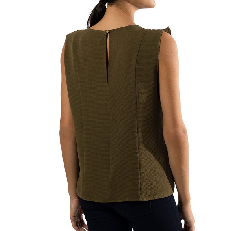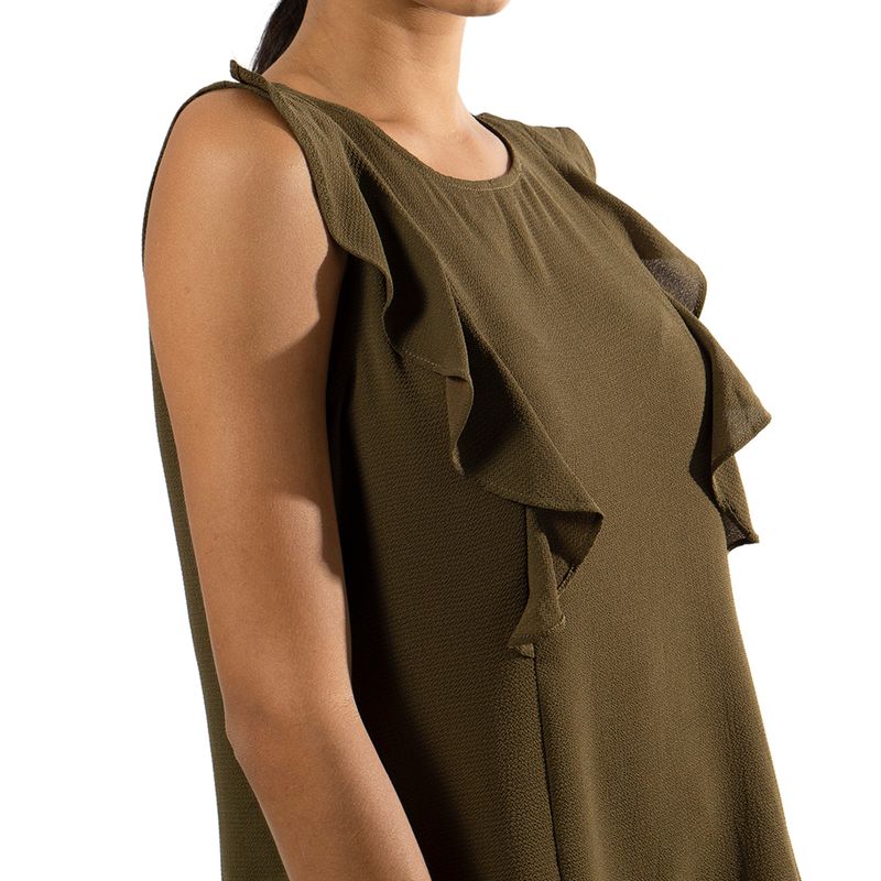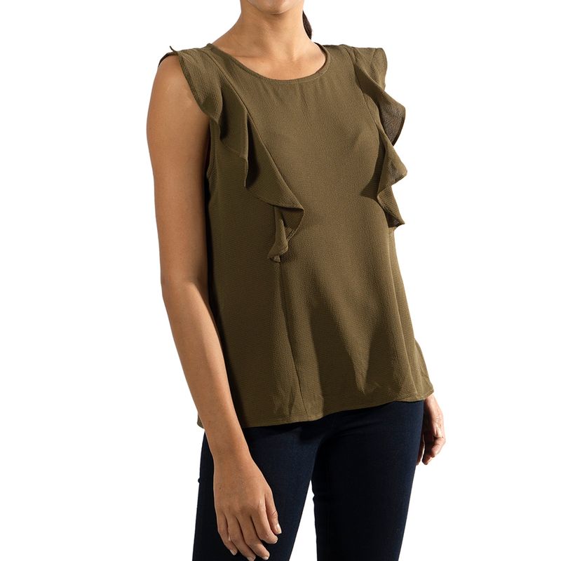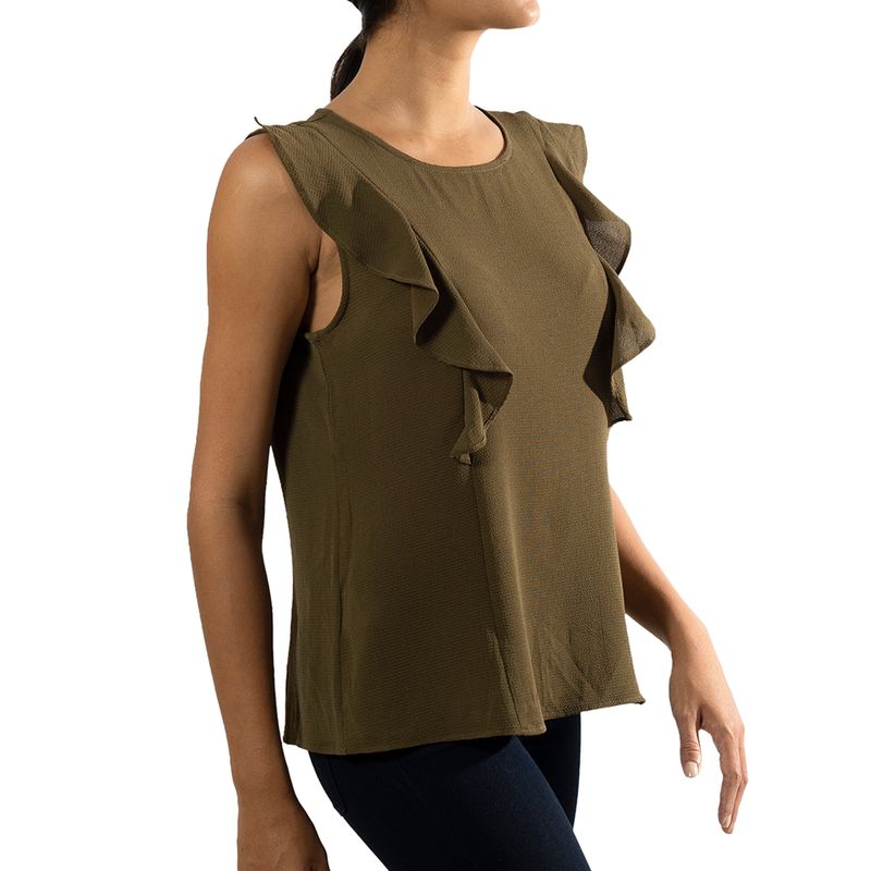 Blusa Maxine Olive elaborada en chiffon, cuello redondo, con detalles de vuelos en el pecho