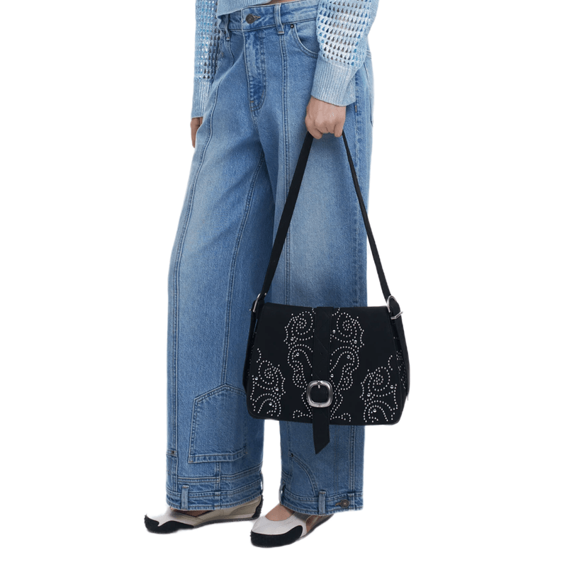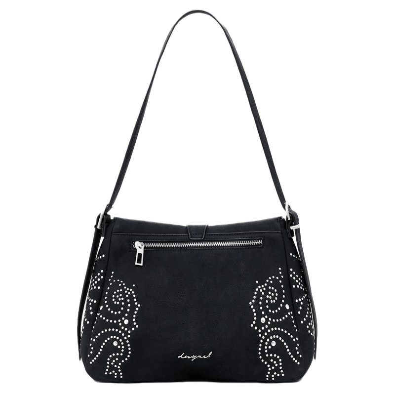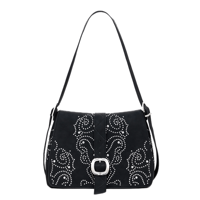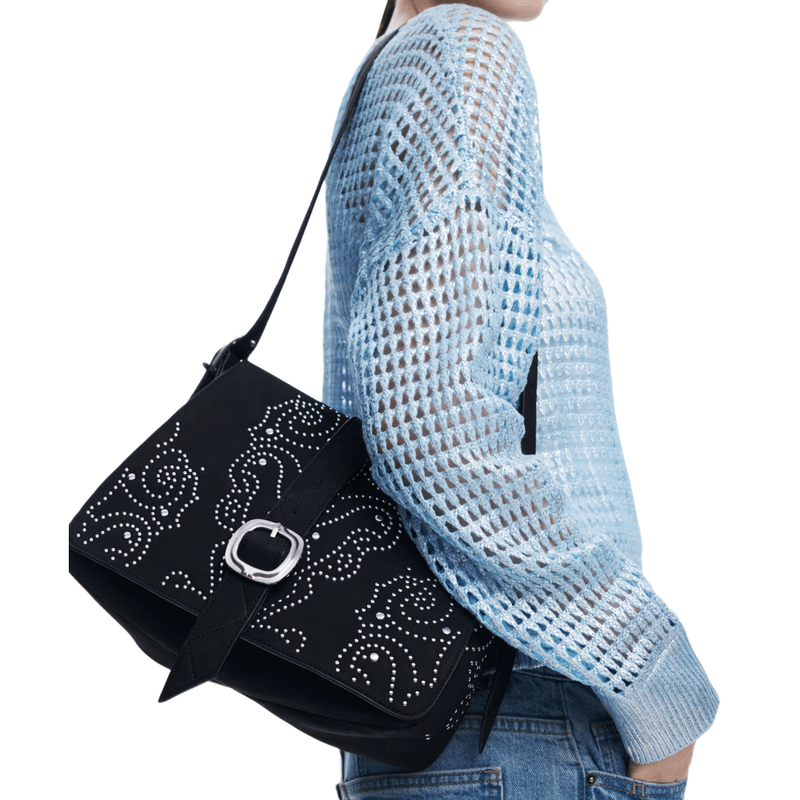 Bolso tipo crossbody confeccionado en material efecto cuero, de diseño liso con detalles metálicos tipo tachas que aportan carácter. Cuenta con correa ajustable para llevarlo cómodamente al hombro o cruzado, cierre con cremallera para mayor seguridad y un interior práctico pensado para el día a día. Un accesorio versátil que combina estilo y funcionalidad en cualquier ocasión.