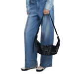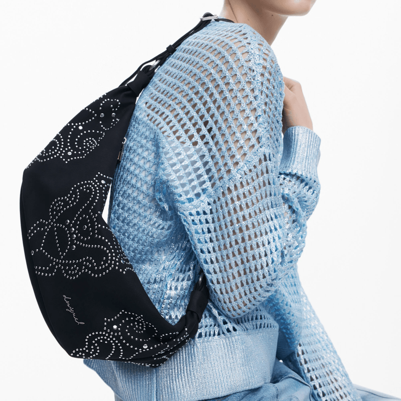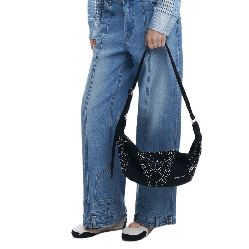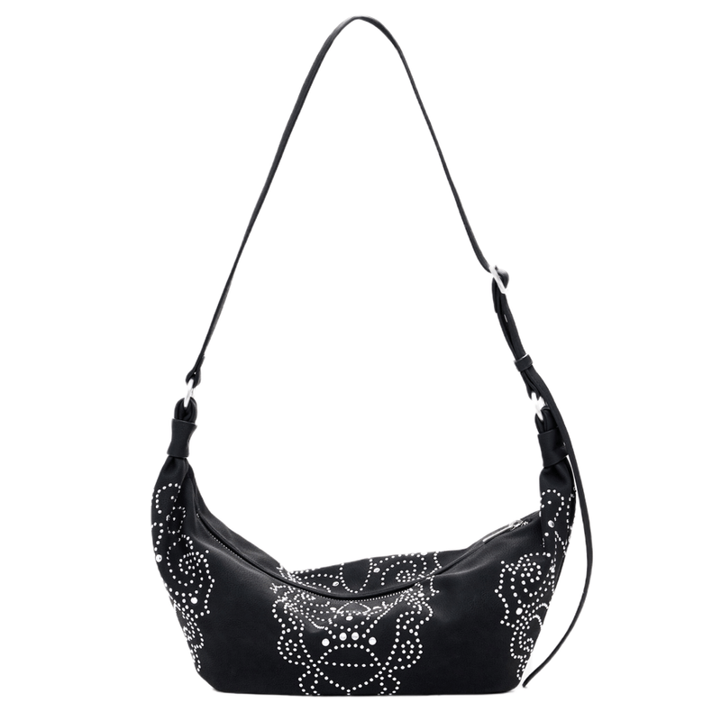 Bolso de mano en tejido ecopiel, color liso, con detalles de tachuelas metálicas, asa ajustable y cierre de cremallera.