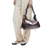 Bolso estilo bandolera en tejido ecopiel, color liso, con detalles de tachuelas metálicas, correa ajustable y cierre de cremallera.