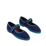 Mary Jane en azul marino con ribete azul y cierre de hebilla. El exterior es de terciopelo 100 % algodón y el interior es de algodón 100 % orgánico con tratamiento antibacteriano. La suela es de caucho procedente de neumáticos de bicicleta reciclados.