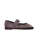 Tejido de terciopelo gris claro con ribetes y cordón de terciopelo gris claro. El exterior del zapato es 100 % terciopelo de algodón y el interior es 100 % algodón orgánico con tratamiento antibacteriano. La suela es de caucho procedente de neumáticos de bicicleta reciclados.