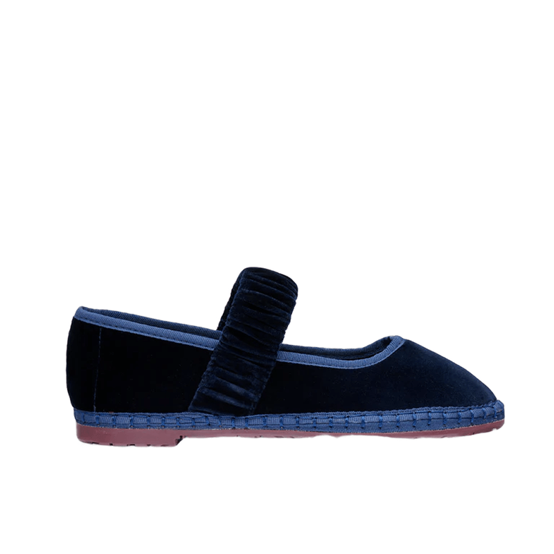 Mary Jane de terciopelo azul oscuro con ribetes y encaje de terciopelo azul oscuro. El exterior del zapato es 100 % terciopelo de algodón y el interior es 100 % algodón orgánico con tratamiento antibacteriano. La suela es de caucho procedente de neumáticos de bicicleta reciclados.