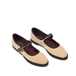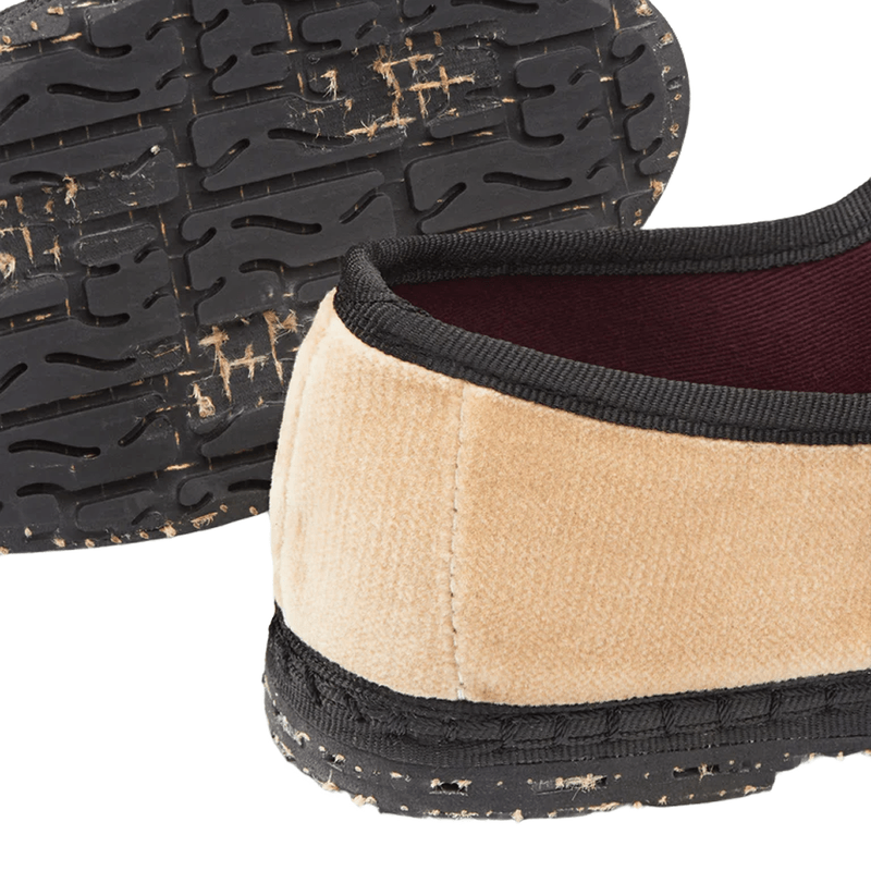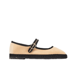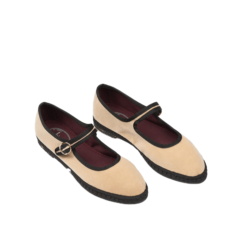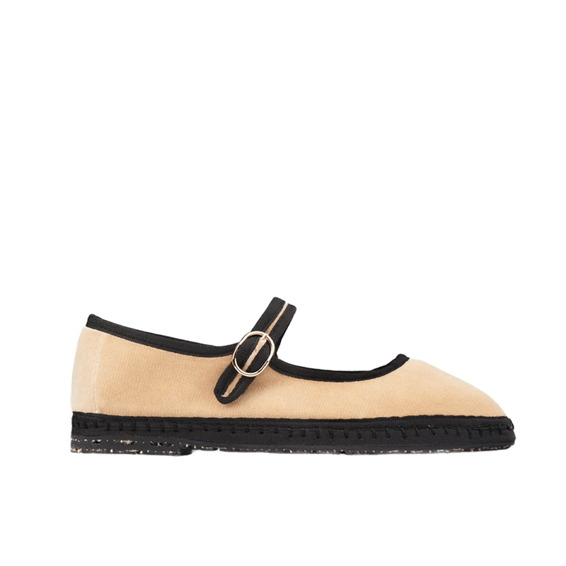 Mary Jane de terciopelo beige con ribete negro y cierre de hebilla. El exterior del zapato es de terciopelo 100 % algodón y el interior es de algodón 100 % orgánico con tratamiento antibacteriano. La suela es de caucho procedente de neumáticos de bicicleta reciclados.