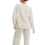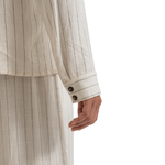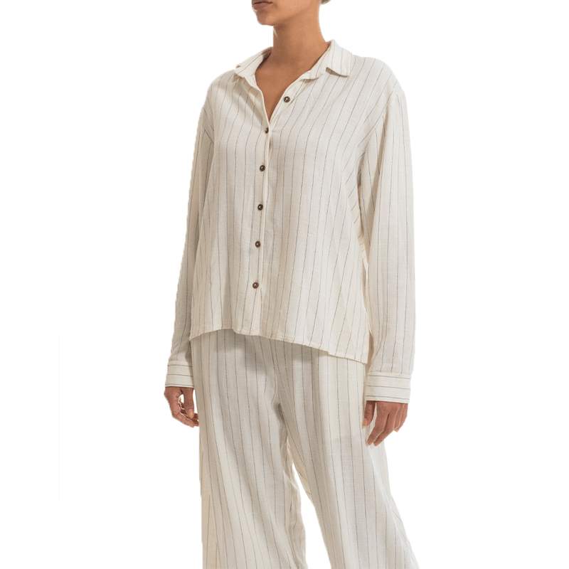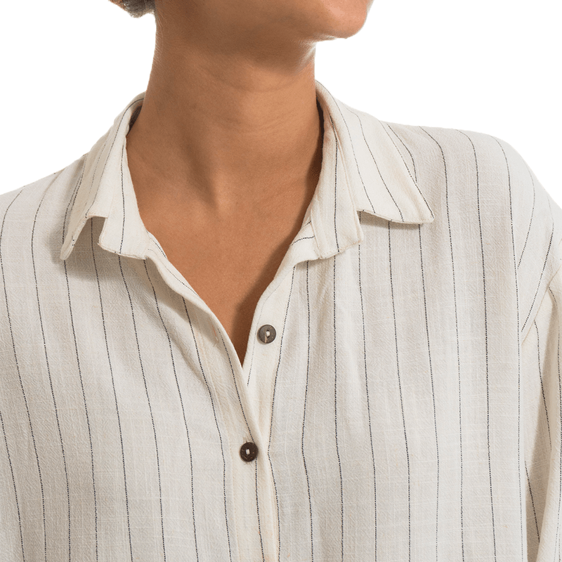 Camisa elaborada en lino con estampado a rayas, cuello tipo camisero y mangas largas. Botones a tono de la prenda