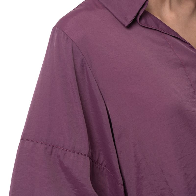 Top crop con manga amplia – Diseño suelto con caída ligera. – Cuello camisero y escote en V. – Manga tres cuartos tipo murciélago. – Tela fluida con acabado satinado. – Corte a la cintura con terminación recta.