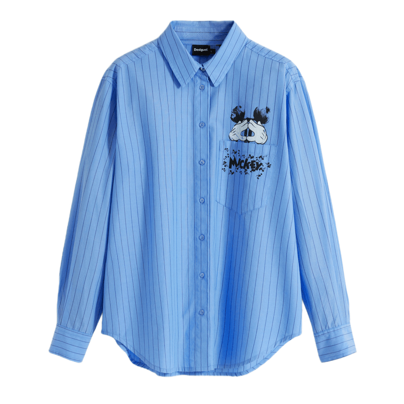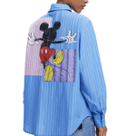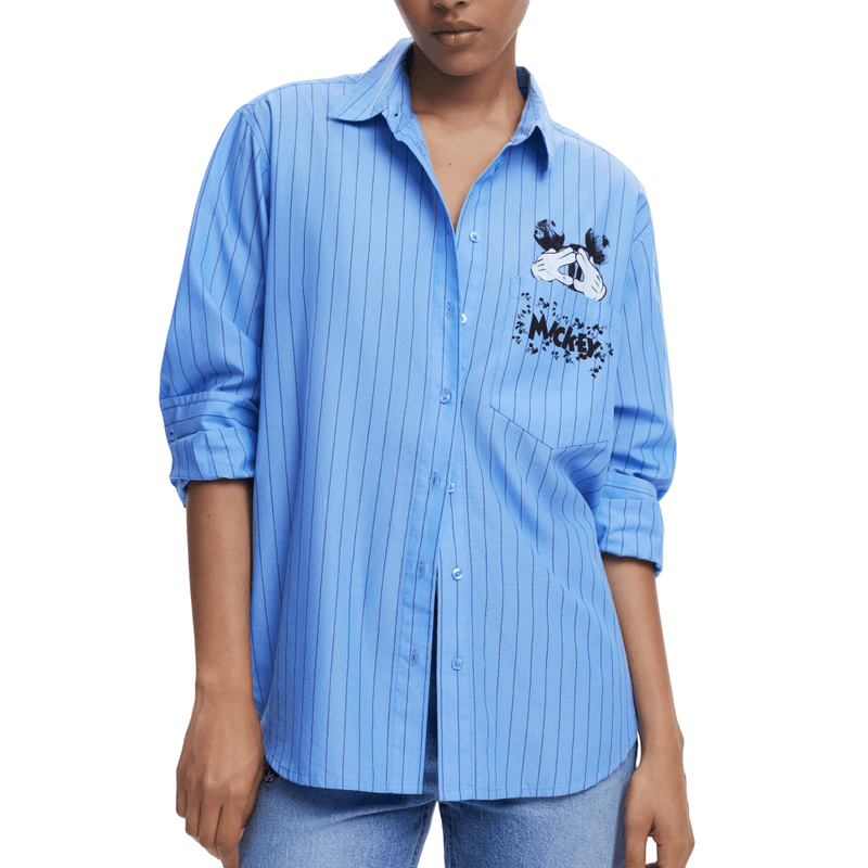 Camisa oversize de manga larga, bolsillo delantero, en color azul con raya diplomática y estampado de Mickey Mouse™.