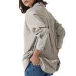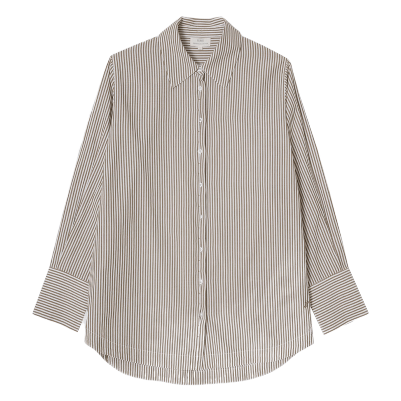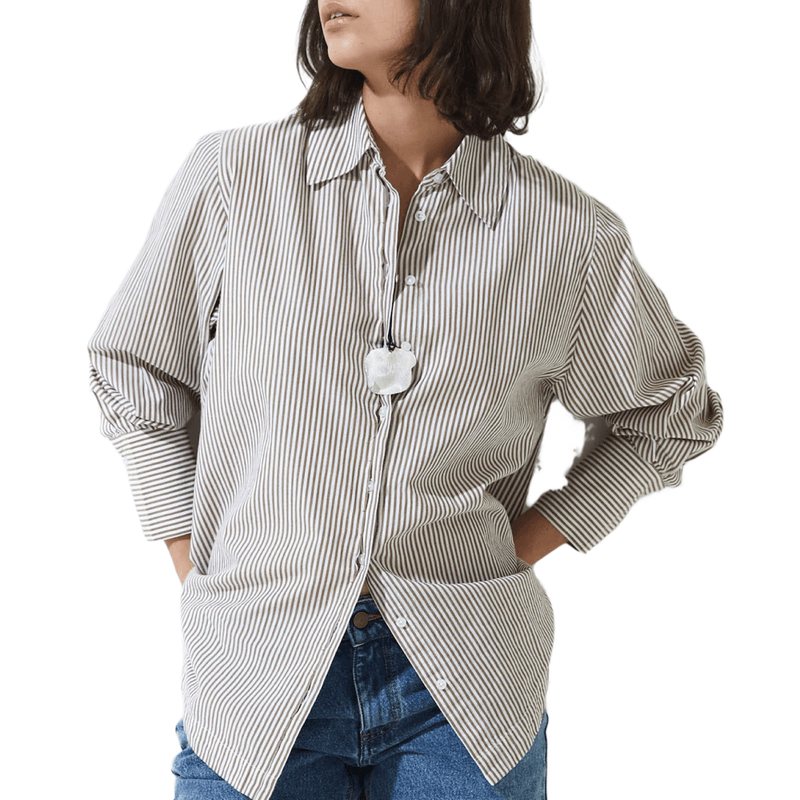 Camisa oversize con rayas camel, de estilo relajado y elegante. Ideal para looks actuales y desenfadados.