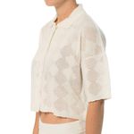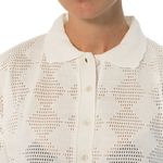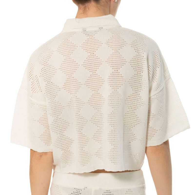 Blusa tejida tipo polo en color blanco con un diseño calado de rombos que combina estilo y frescura. Su corte cropped y mangas amplias le dan un toque moderno y relajado. Ideal para complementar atuendos casuales y ligeros. Fabricada con materiales cómodos y transpirables.