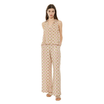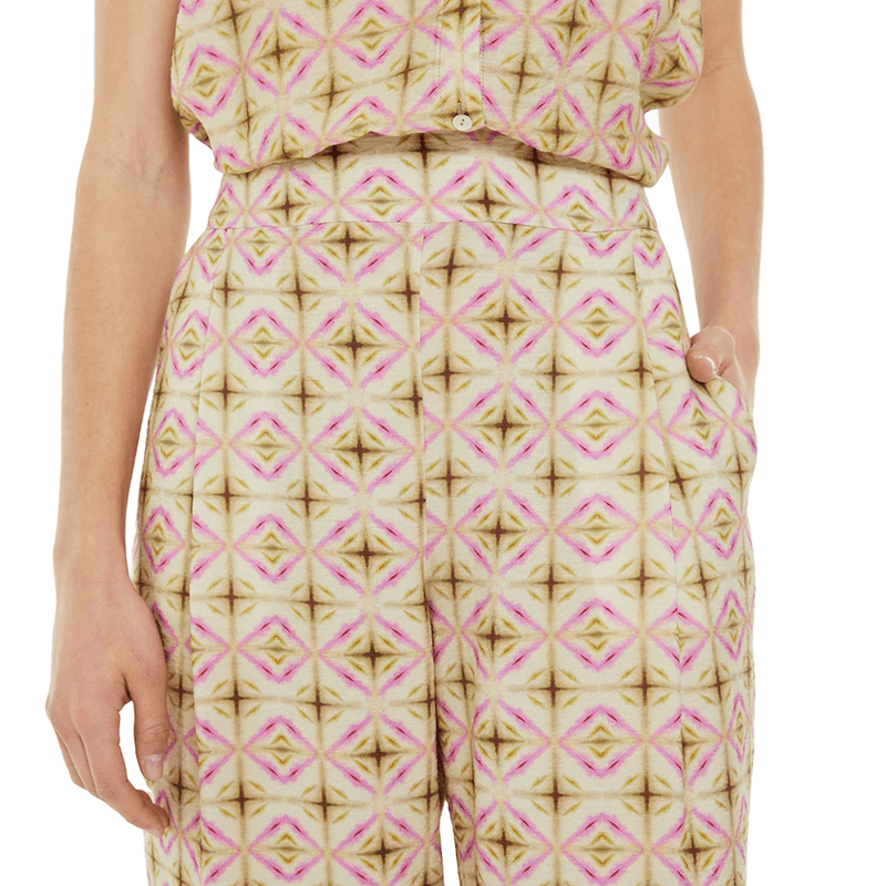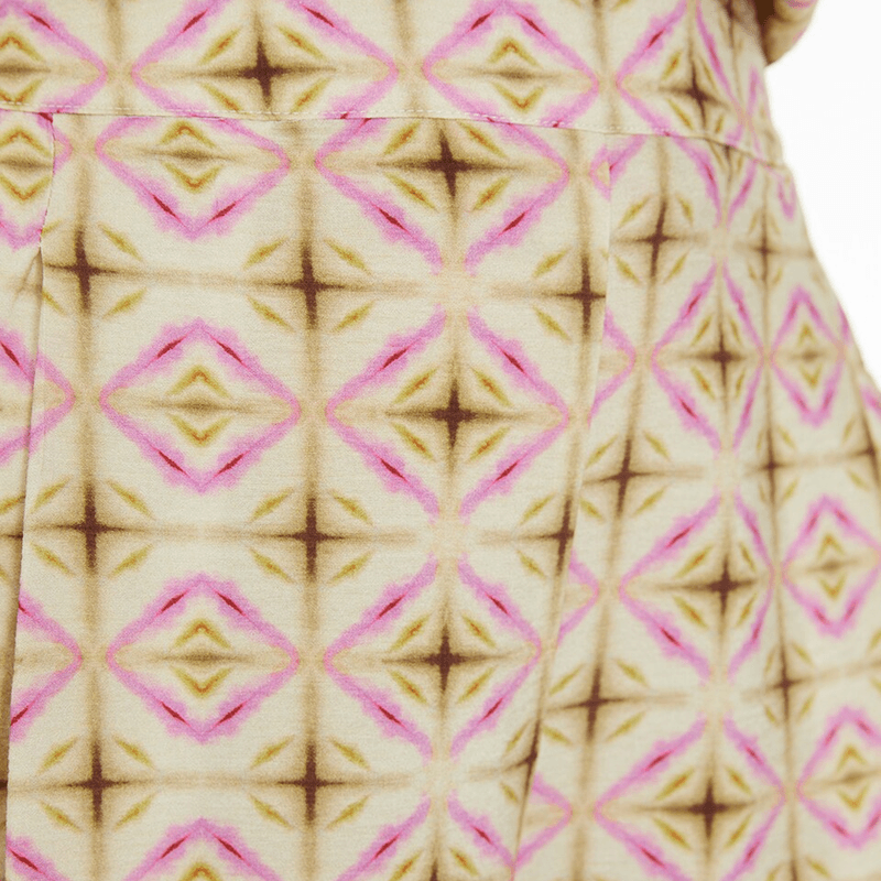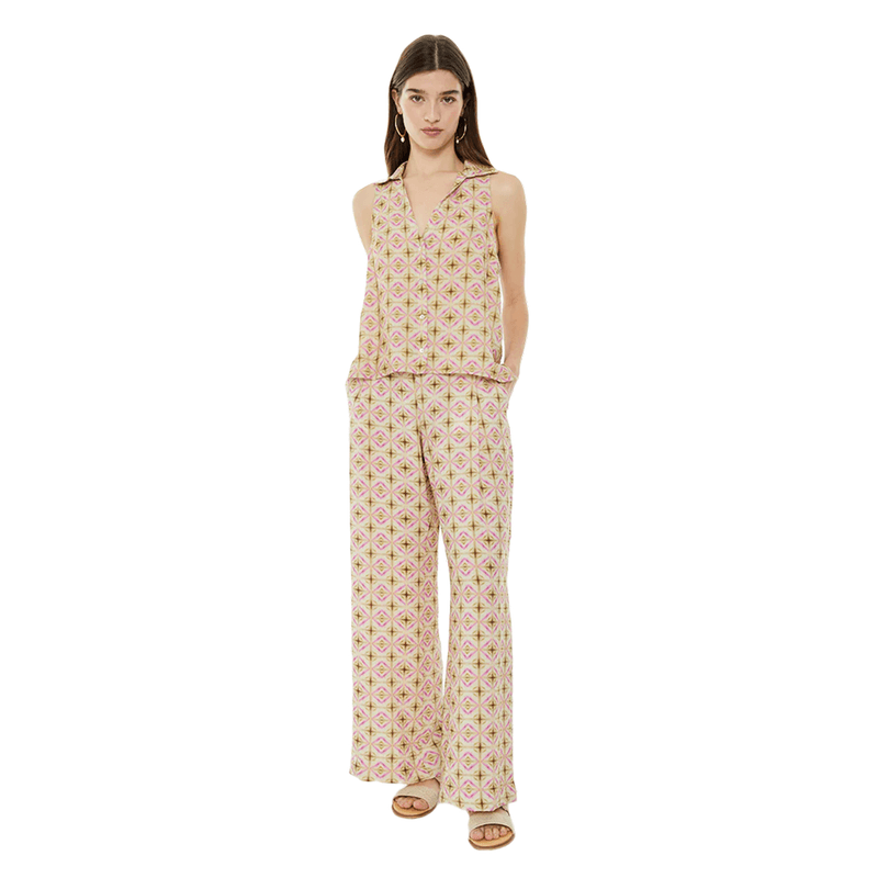 Camisa de mujer con un estampado geométrico, sin mangas, cuello camisero. Cierre de botones en el delantero y detalle de aberturas laterales. Prenda sostenible. Composición: 100 % Viscosa