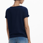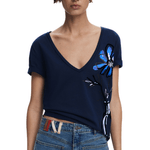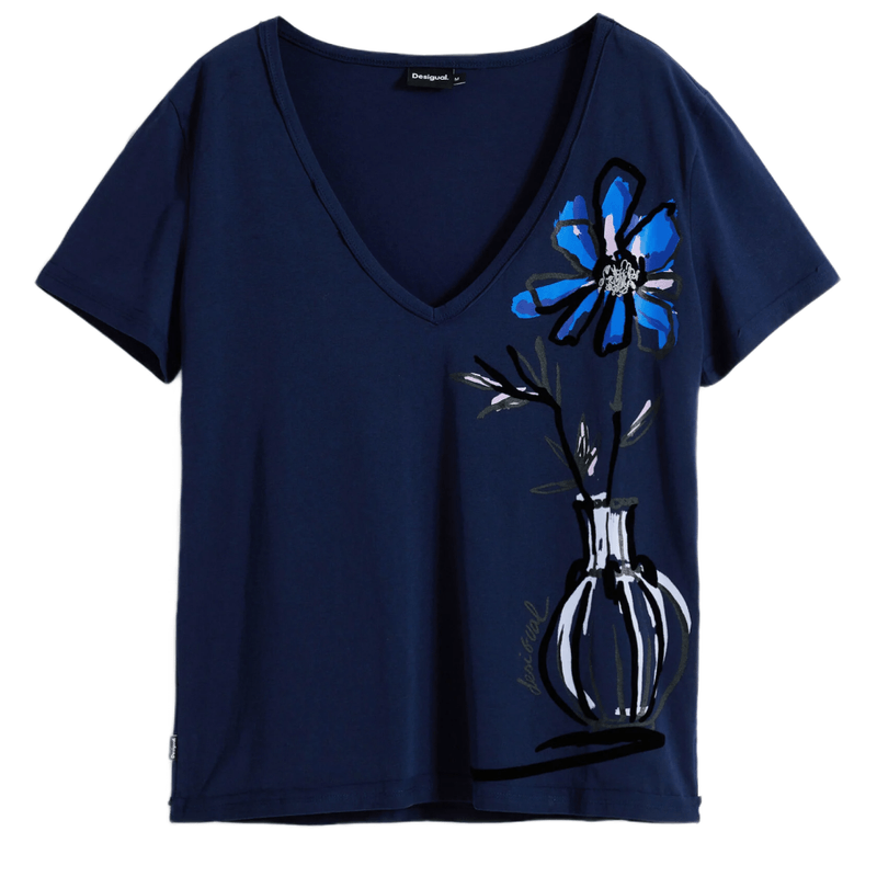 Camiseta de manga corta y escote en pico en color azul marino con estampado de jarrón con flor.