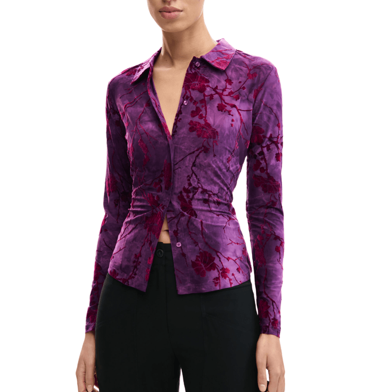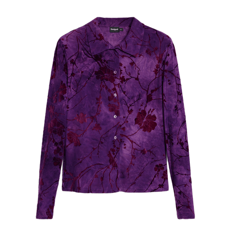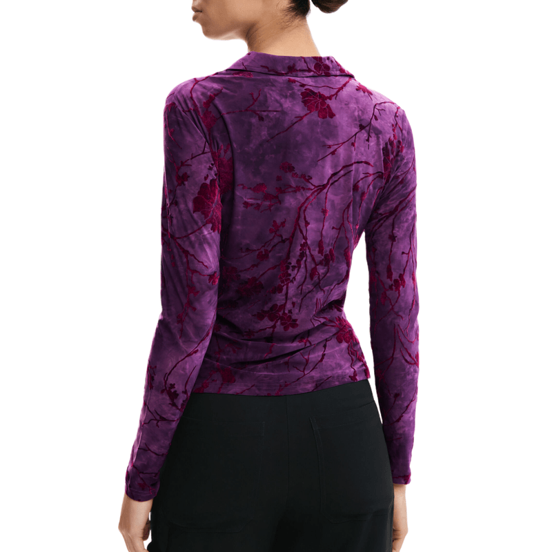 Camiseta con tejido devoré de manga larga, con abotondura delantera y estampado floral de ispiración oriental en tonos morados.