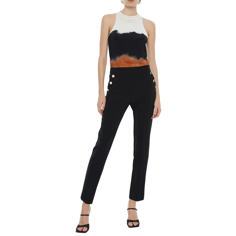 Camiseta estampada tie and dye, cuello halter. Detalle en escote de canalé con un perfil en hilo metalizado color cobre. Regualr fit.