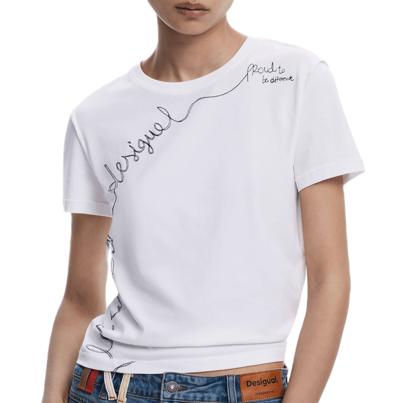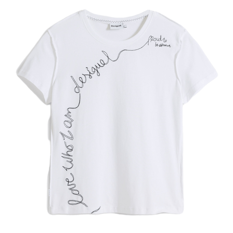 Camiseta de manga corta y cuello redondo en color liso con frase bordada con hilo a contraste y puntadas largas.