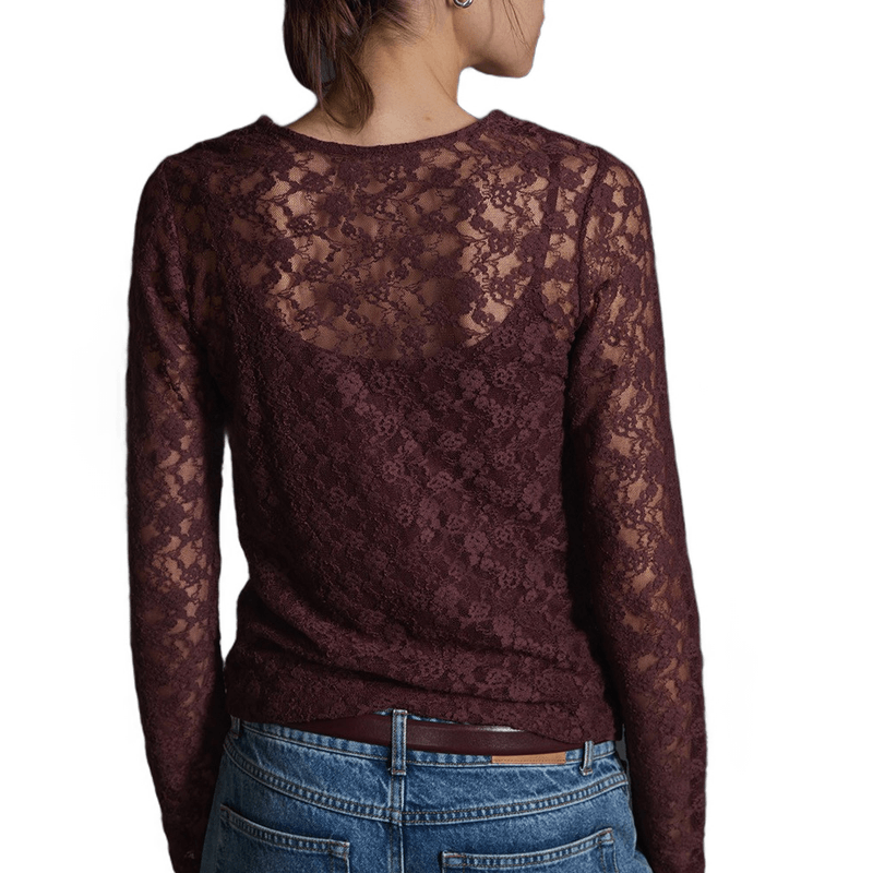Camiseta de encaje en color aubergine, delicada y sofisticada. Una prenda especial que aporta un aire romántico y elegante.