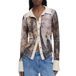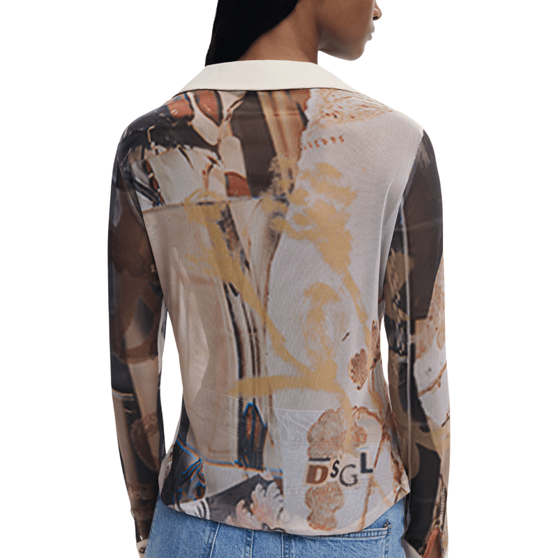 Camiseta de gasa de manga larga, abotonadura delantera y detalle de cuello y puños anchos en canalé.