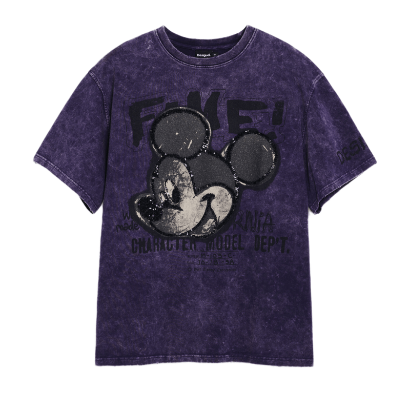 Camiseta de manga corta con cuello redondo en efecto desgastado con detalles de lentejuelas, rotos y estampado de Mickey Mouse™.
