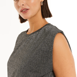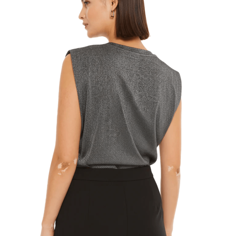 Camiseta con acabado de brillo suave ideal para ocasiones especiales. Su textura aporta luminosidad controlada sin perder sofisticación. COMPOSICIÓN: Poliéster 43%. Viscosa 23%. Hilo metalizado 16%. Poliamida 14%. Elastán 4%
