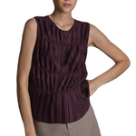 Camiseta plisada en tono aubergine, fluida y sofisticada. Ideal para crear looks femeninos con un toque refinado.