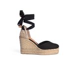 Alpargata con cuña hecha en lona de algodón negro. Diseño en capellada en V. Se cierra con dos cintas en el tobillo. Puntera reforzada, cerrada y redonda. Suela vulcanizada de caucho color topo.