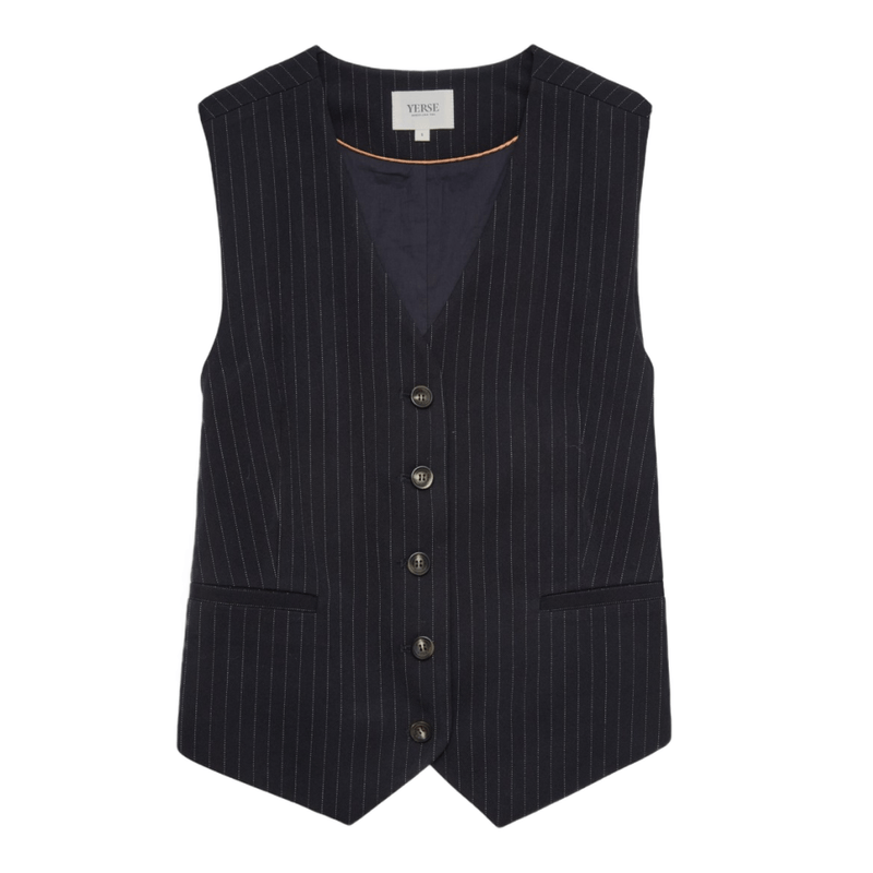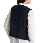 Chaleco confeccionado en tejido jacquard con rayas navy, de diseño estructurado y sofisticado. Perfecto para elevar looks coordinados o añadir un toque elegante a conjuntos básicos.