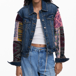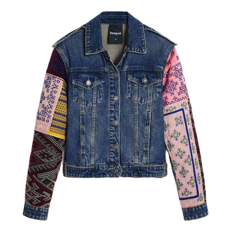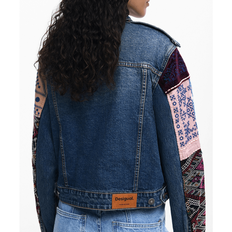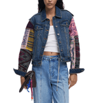 Chaqueta vaquera estilo moderno con bolsillos delanteros y mangas confeccionada en tejido patchwork de inspiración étnica.