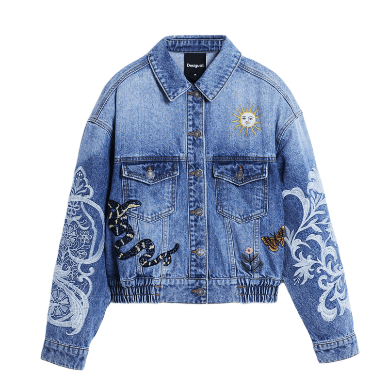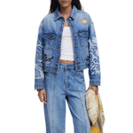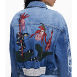 Chaqueta vaquera tipo trucker con efecto lavado suave y grandes bordados con motivos de inspiración oriental.