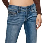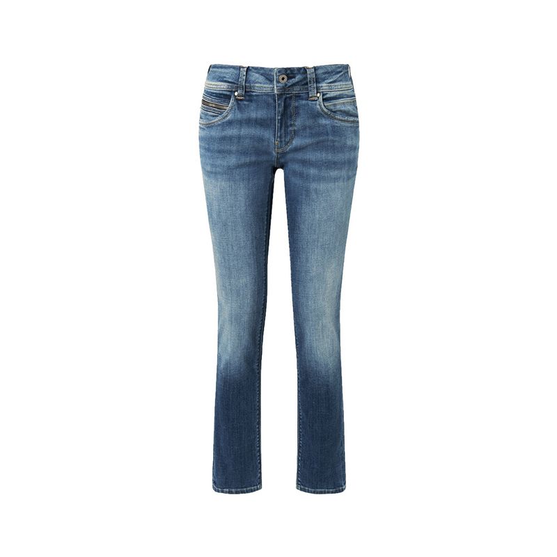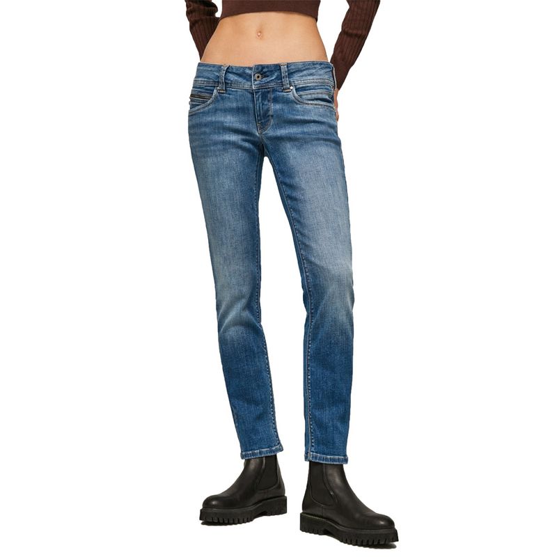 Jeans Fit regular, tiro medio, pierna slim, lavado light blue bleach powerflex, estilo 5 bolsillos, detalle stitching en bolsillos traseros, quinto bolsillo con cierre de cremallera.