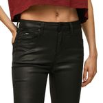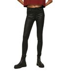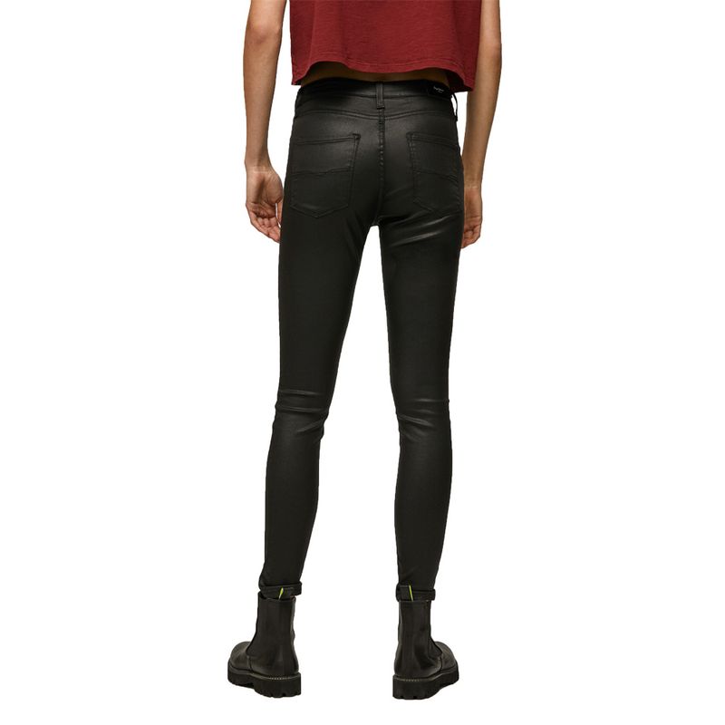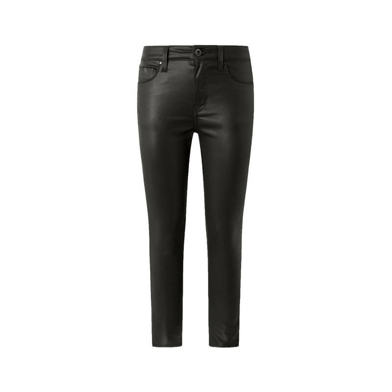 Vaqueros elásticos confort, ceñido, cintura alta, lavado revestido negro estilo de 5 bolsillos con bolsillos traseros con costura.