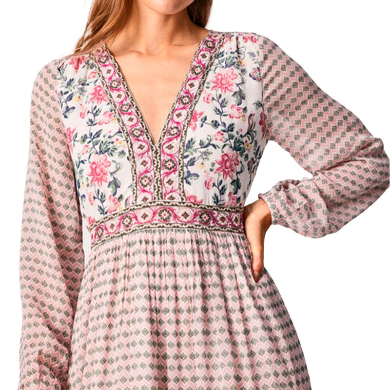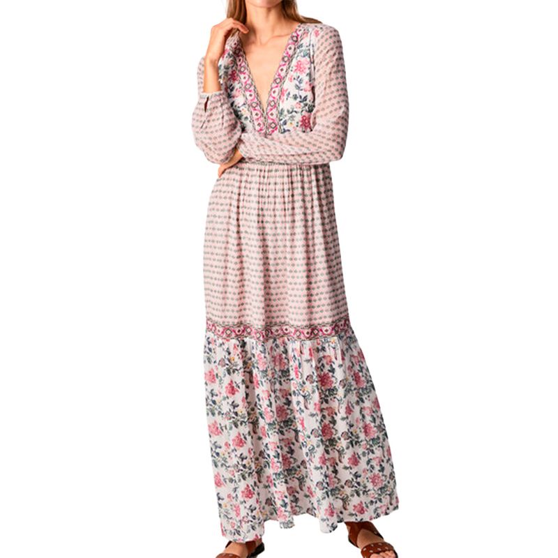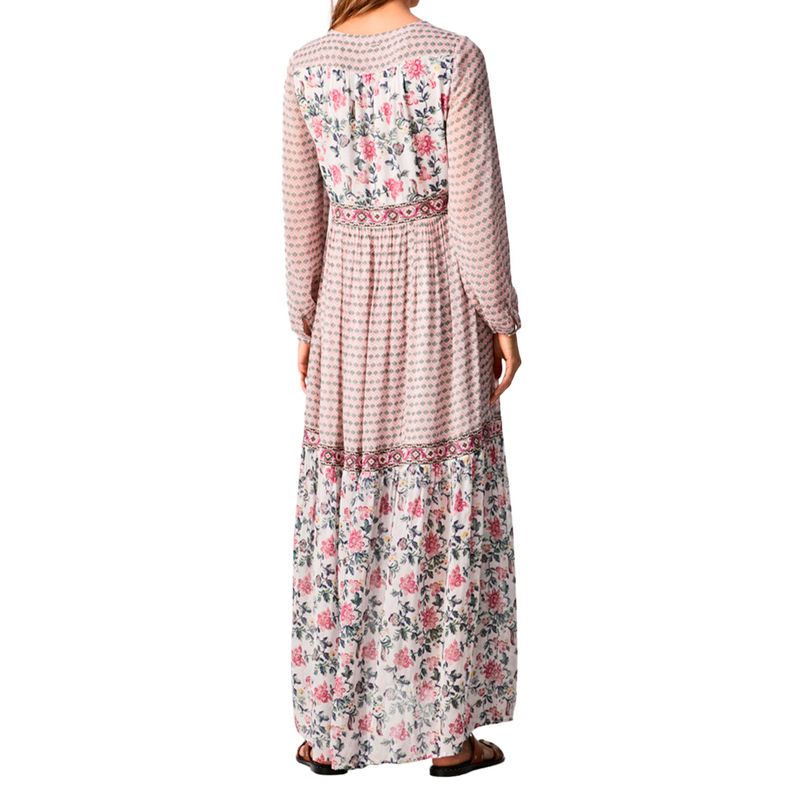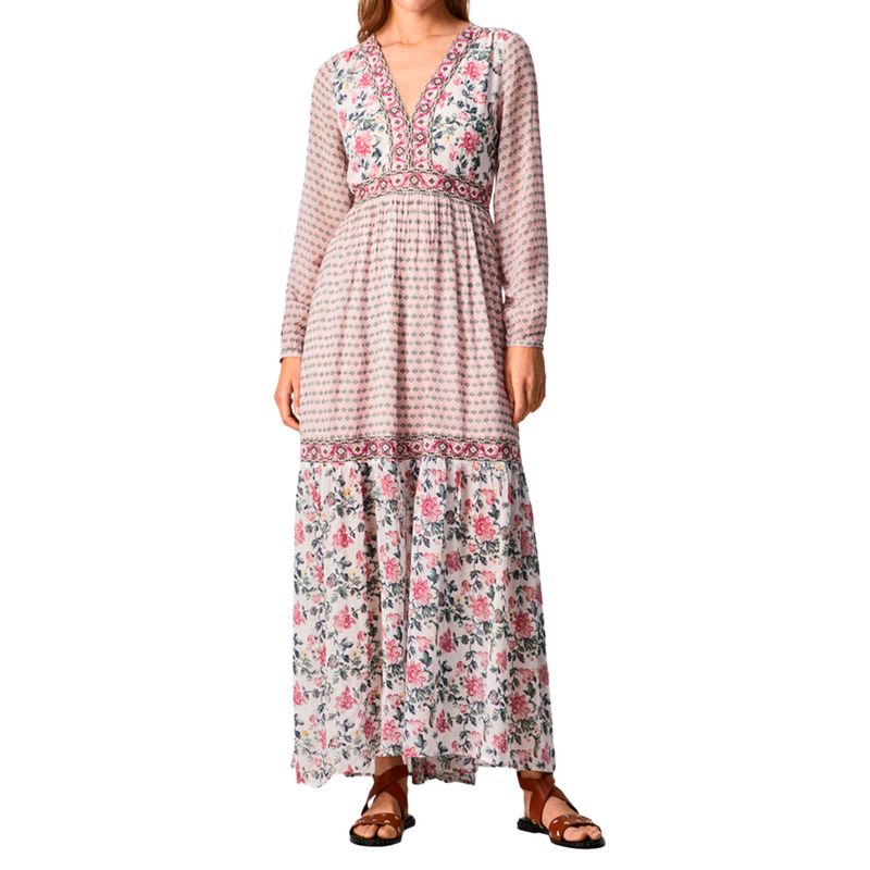 - Vestido largo manga larga tejido fluido- Escote en V pronunciado- Detalle bordados- Manga larga semitransparente- Corte a la cintura- Estampado combinado- Ondas en bajo