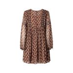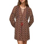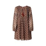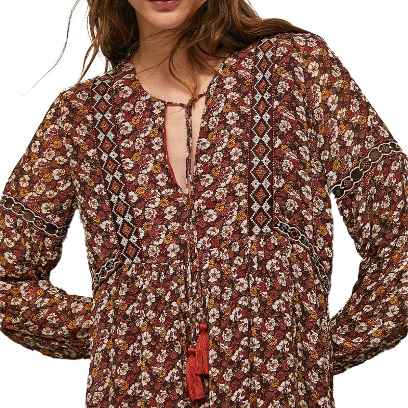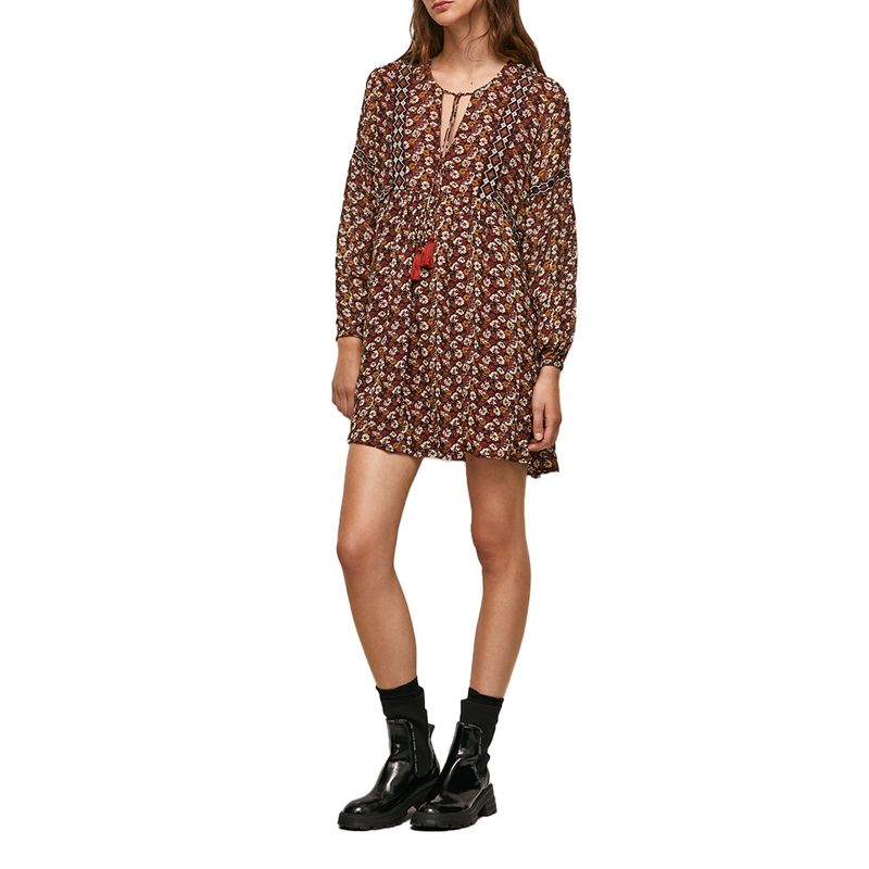 Vestido corto estampado de flores con cuello en V y manga larga con puño ajustado. Detalles de bordados y adornos, detalle de encaje y arco del cuello.