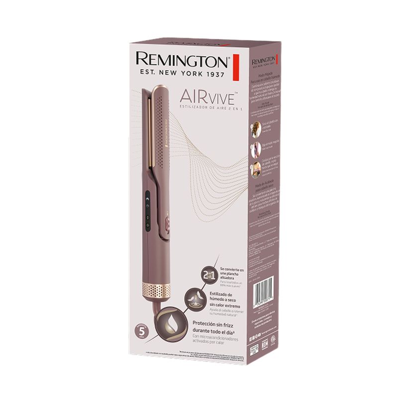 El estilizador de aire 2 en 1 Remington Airvive seca y alisa el cabello en un solo paso sin calor extremo, ayudando a preservar su hidratación natural y reducir el daño. Gracias a su tecnología de aire iónico y placas de cerámica con microacondicionadores, combate el frizz, elimina la estática y deja el cabello hasta 80% más suave. Cuenta con dos modos de uso, para cabello húmedo y seco, permitiendo desde un secado rápido hasta un acabado pulido, además de una cubierta curva que facilita crear ondas o dar forma al peinado, logrando resultados versátiles con un acabado profesional en menos tiempo.