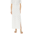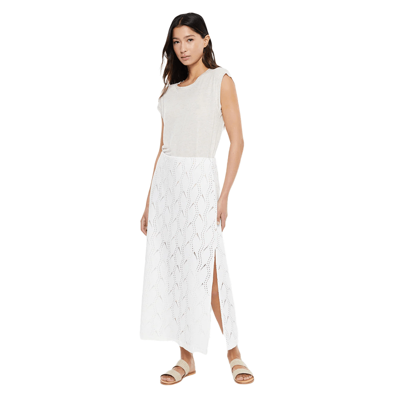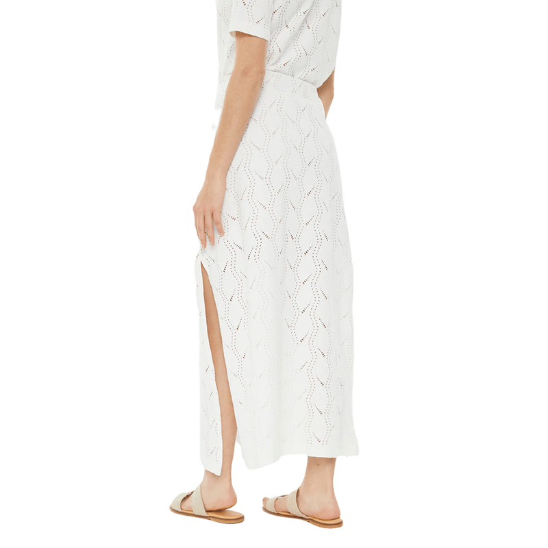 Falda de mujer midi calada, con goma en la cintura y detalle de abertura en costura lateral. Prenda sostenible. Composición: Algodón orgánico 95%, Elastano 5% | Forro: Poliéster 100%