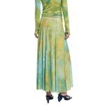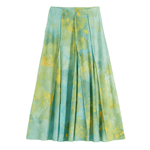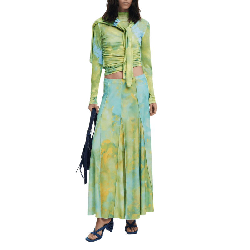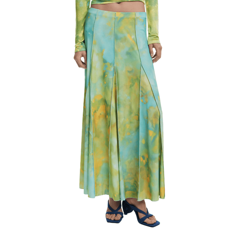 Falda larga con godets, costuras inversas, cinturilla elástica y estampado floral difuminado.