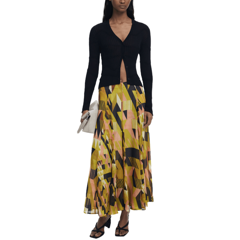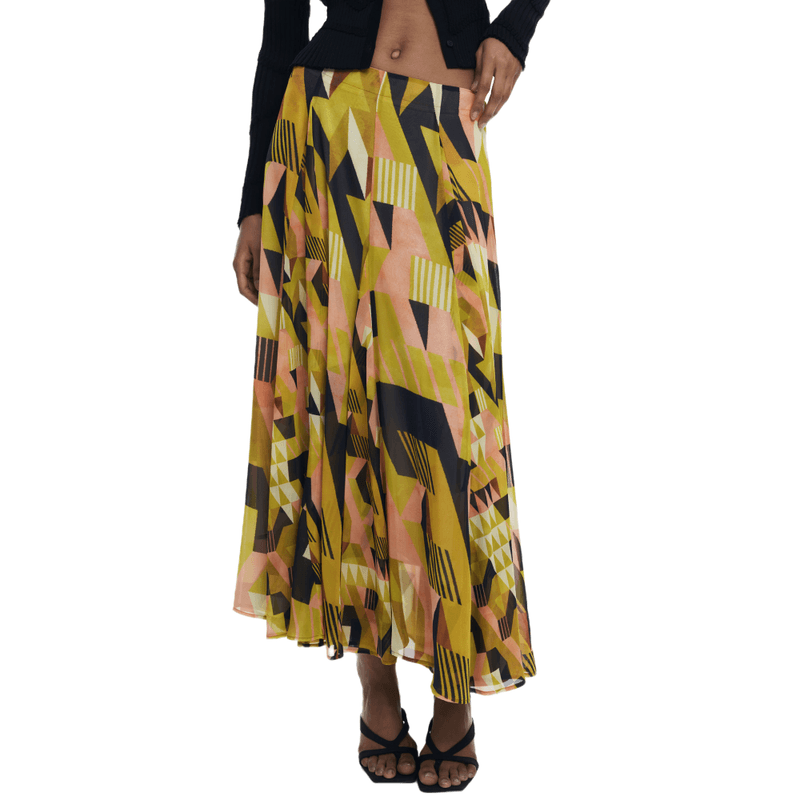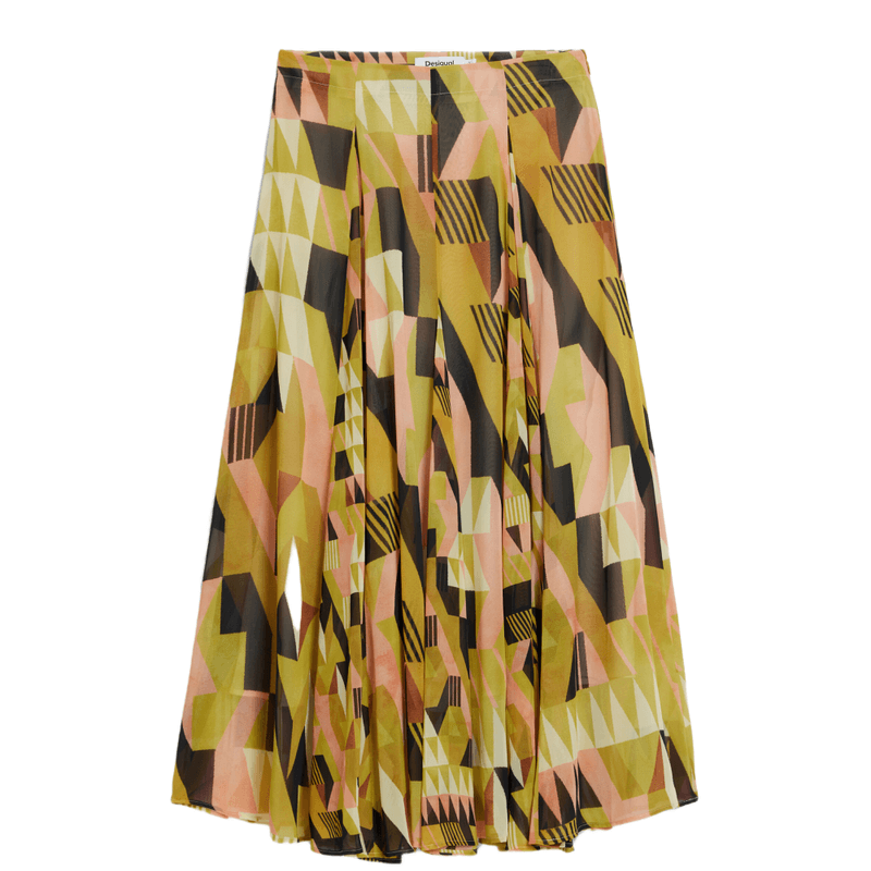 Falda hasta la rodilla con vuelo y estampado geométrico diseñada por Monsieur Christian Lacroix.