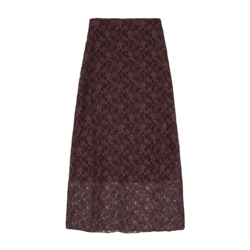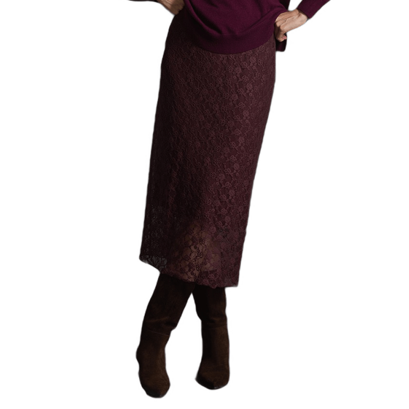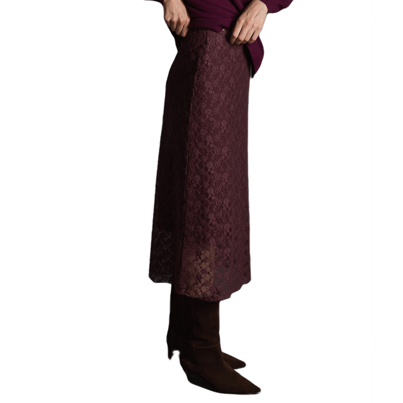 Falda midi de encaje en color aubergine, elegante y femenina. Perfecta para looks sofisticados y eventos especiales.