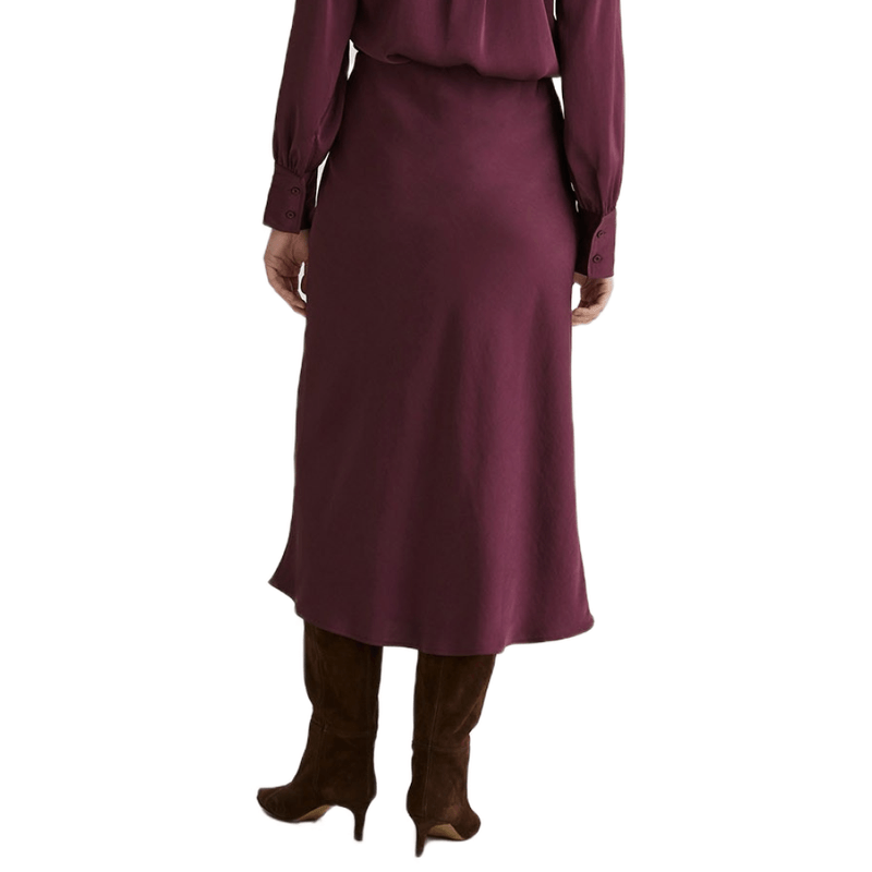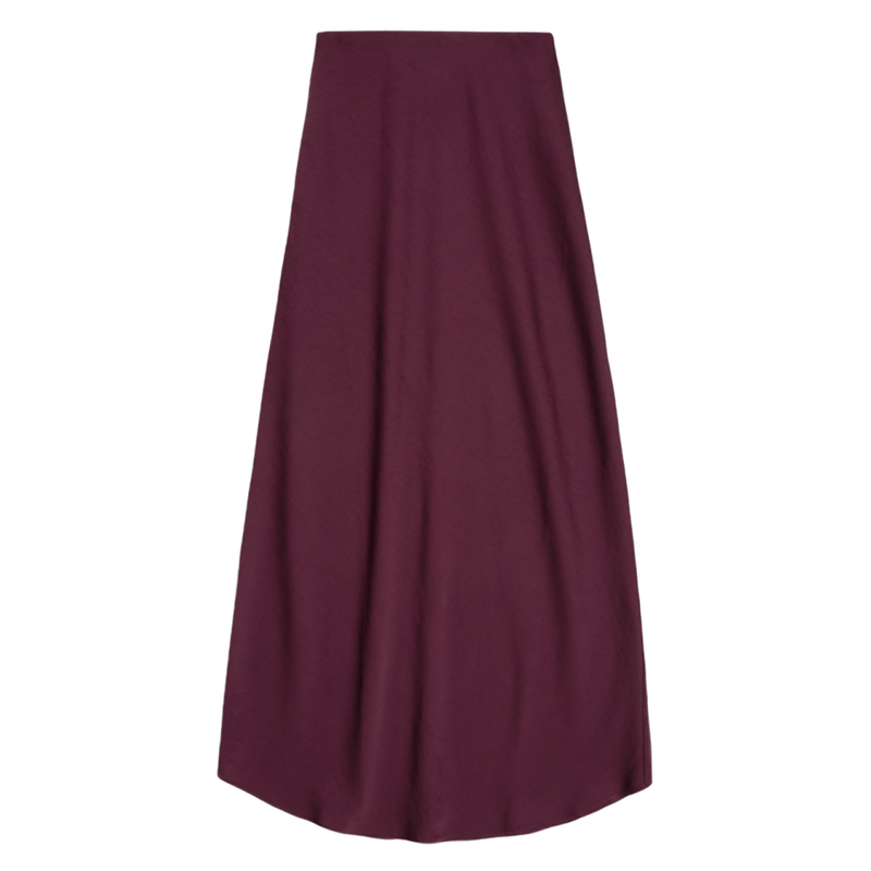 Falda satinada en tono aubergine, con movimiento ligero y acabado elegante. Perfecta para ocasiones especiales o looks cuidados.