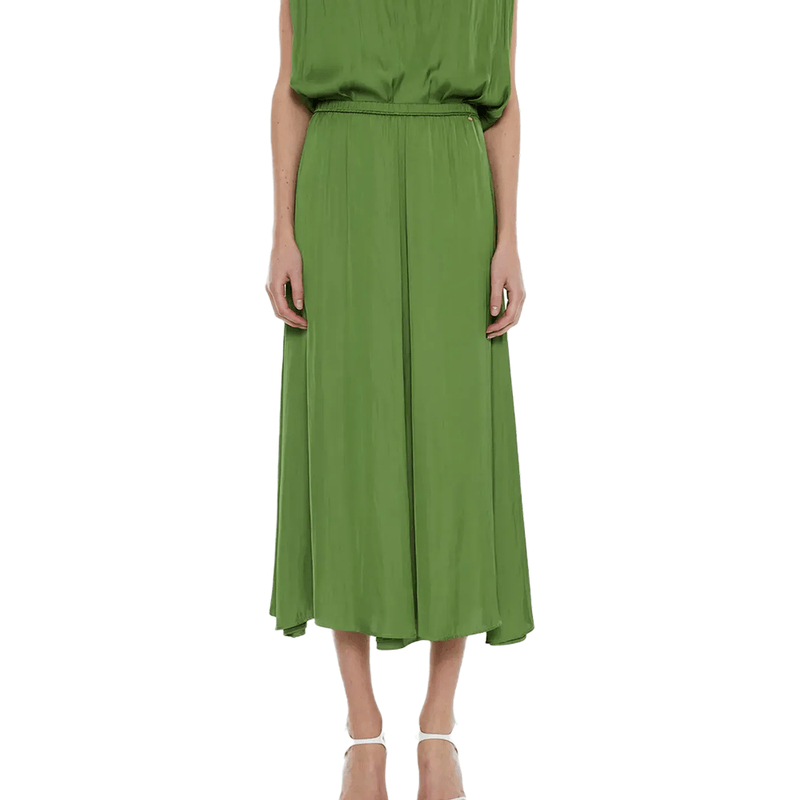 Falda midi satinada goma elástica en cintura. Puedes encontrar su camisa a conjunto y conseguir un efecto vestido. Regular fit.