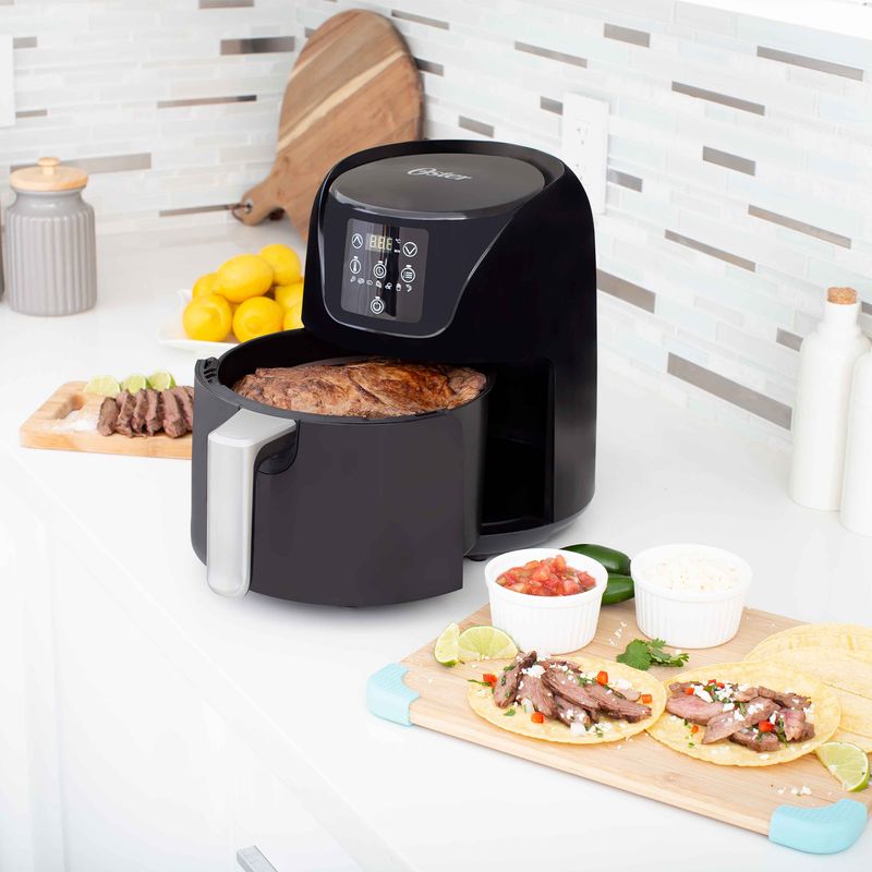 Freidora de aire Oster de 1000W con capacidad de 4 litros y control digital. Cocina alimentos crujientes con poco o nada de aceite para una alimentación más saludable.