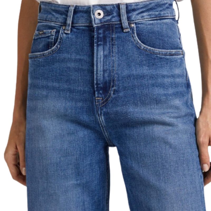 - Realizado en denim elástico con lavado azul medio y efecto desgastado.