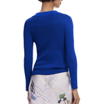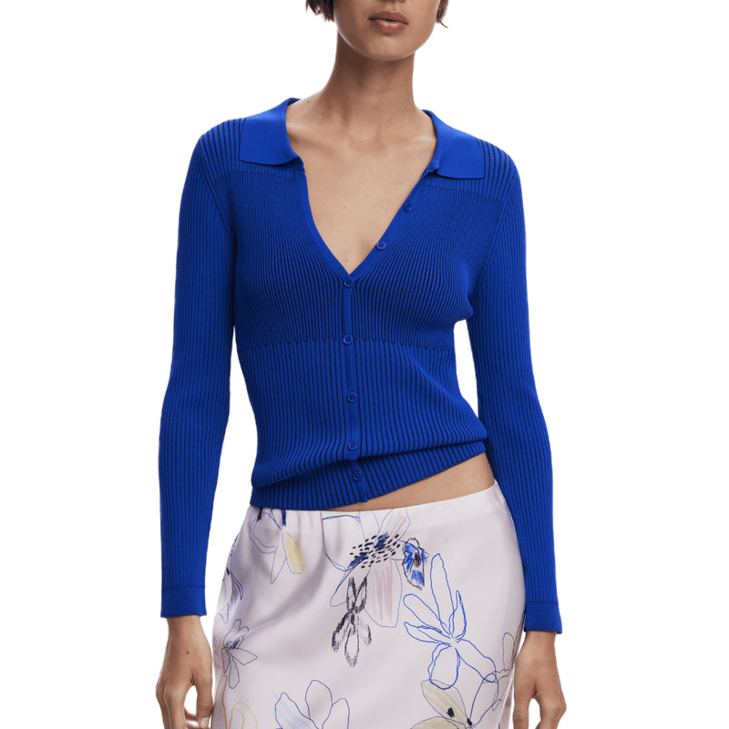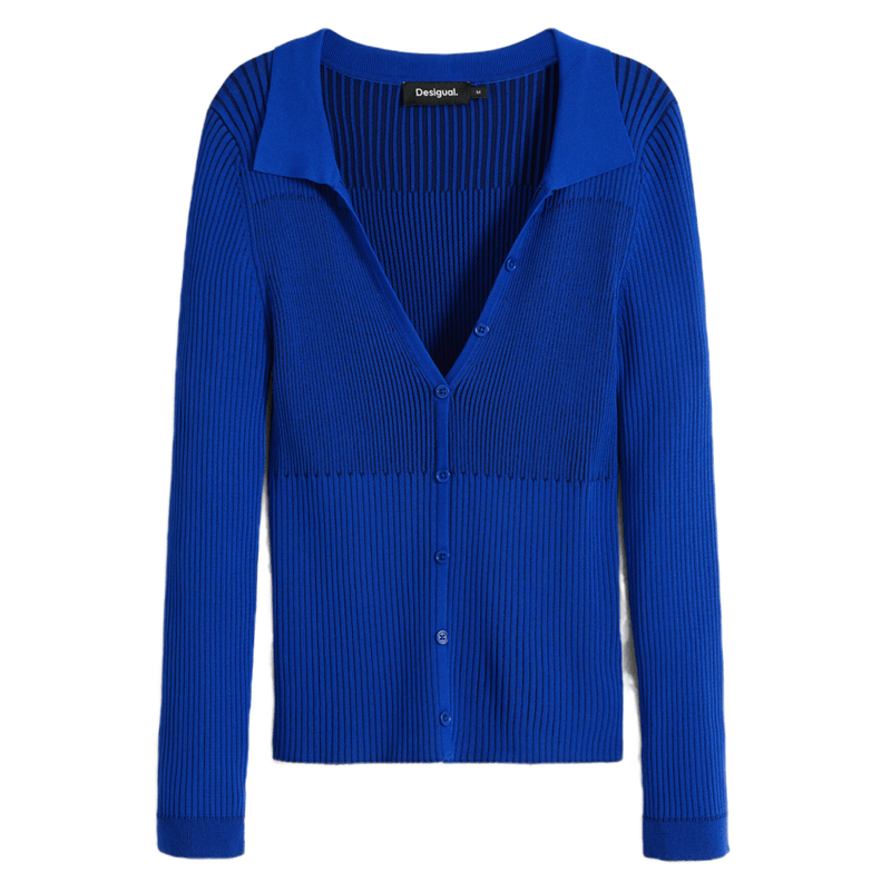 Jersey fino ajustado tipo cárdigan, con abotonadura delantera y cuello tipo camisa en color liso con combinación de tejidos en punto.