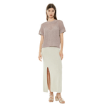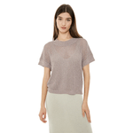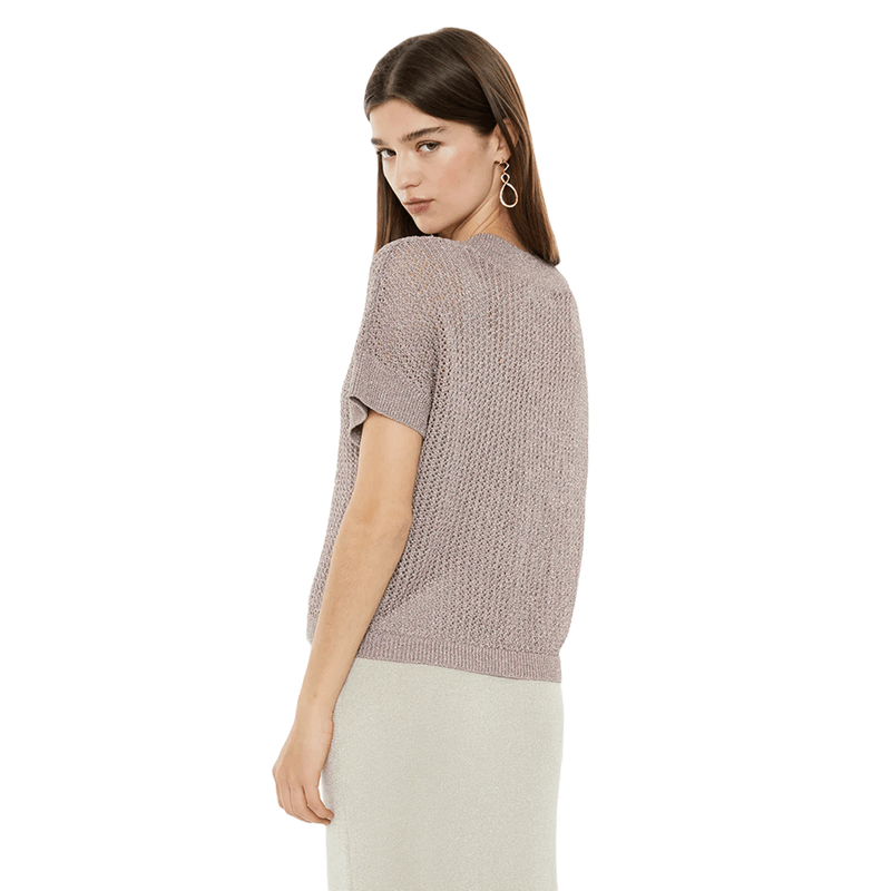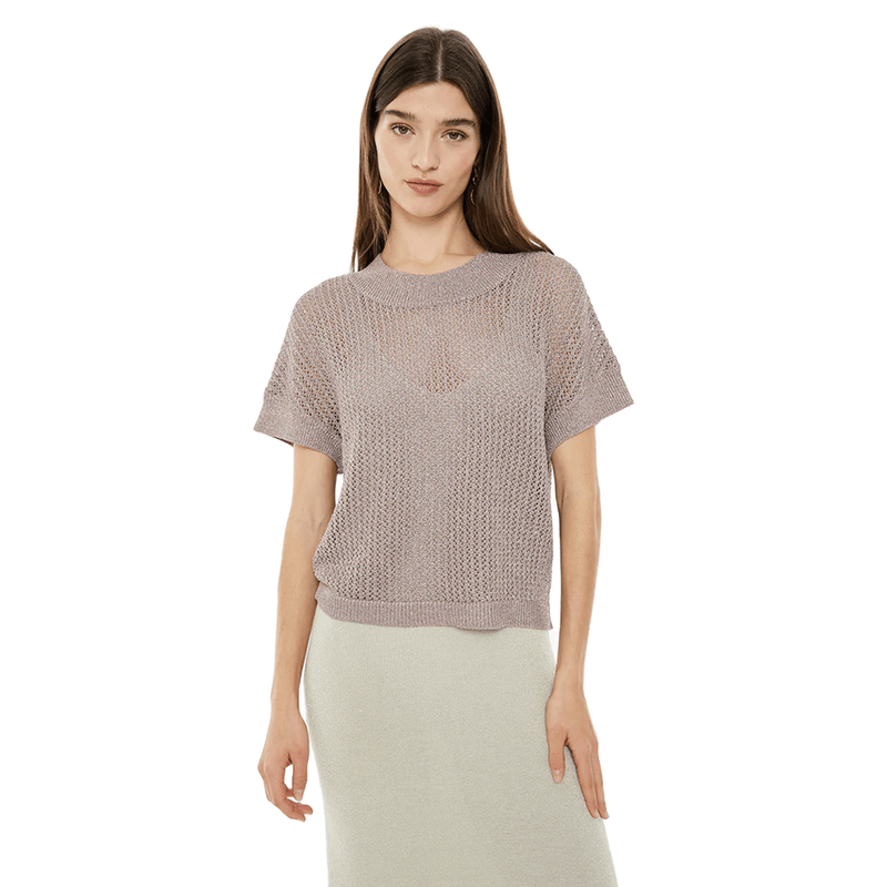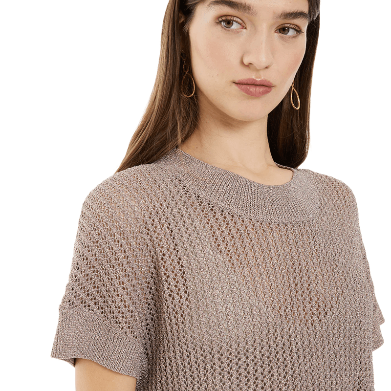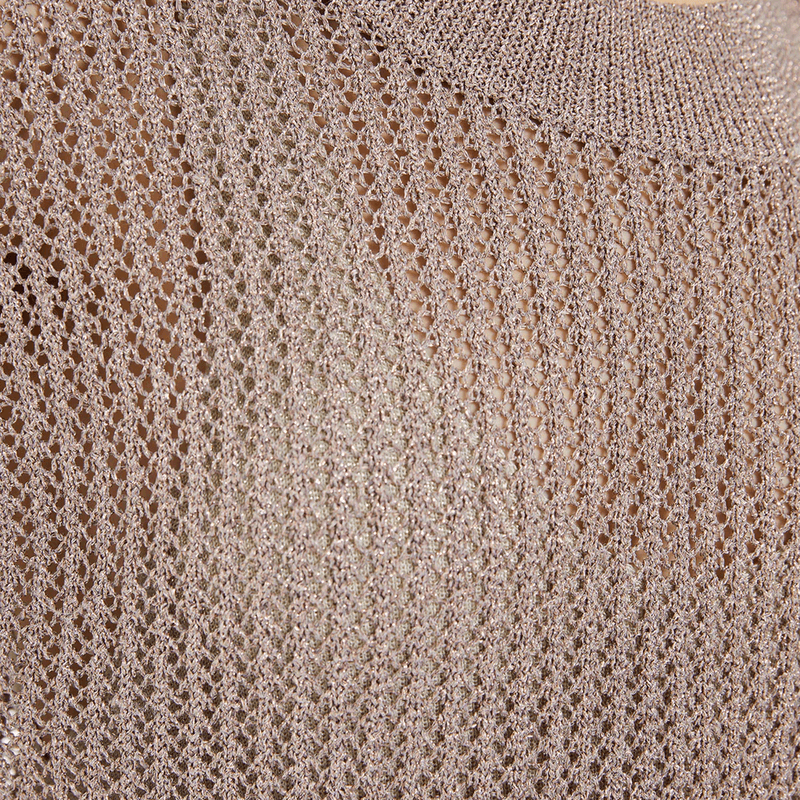 Jersey calado de mujer con punto de lúrex, manga caída, escote redondo y acabados en rib. Composición: Políester 100%