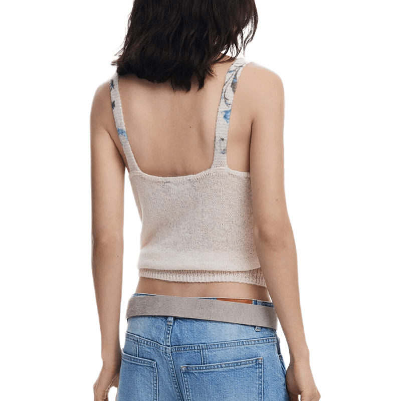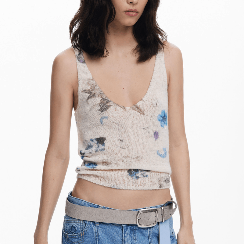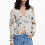 Jersey tipo cárdigan dos piezas con top de tirantes y chaqueta abtonada y estampado flolal.