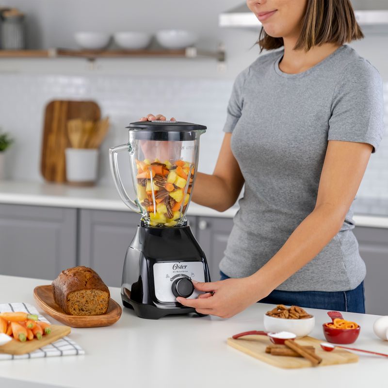 Licuadora Oster con 2 velocidades y diseño práctico en color negro. Ideal para licuados diarios, jugos y mezclas rápidas con potencia eficiente para el hogar.